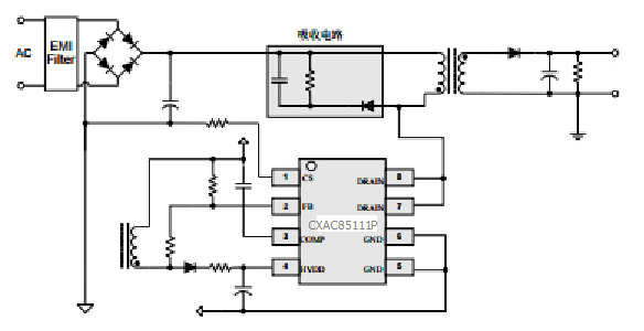 CXAC85111P是应用于离线式小功率AC/DC开关电源的高性能原边反馈控制功率开关芯片,在全电压输入范围内实现高精度恒压/恒流输出,精度均小于±3%,并可使系统节省光耦和TL431等元件,降低成本。 芯片内部集成了高压功率开关、逐周期峰值电流限制、HVDD过压保护、HVDD欠压保护、HVDD电压钳位等完善的保护功能,以提高系统的可靠性